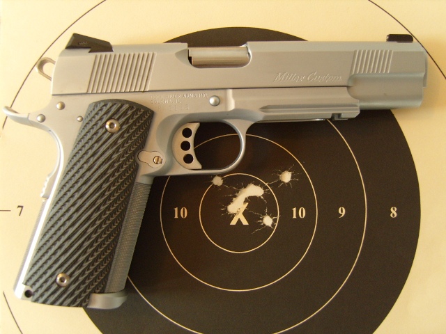sales@millercustom.comPhone (309)-737-2466 All complete 1911 styled guns that leave my bench are test fired and supplied with a test target from the Ransom Rest. Whether I simply do an action job or a full house build, you deserve to know what the gun is capable of shooting. Simply running ammunition through it to check reliability isn't enough by my standards. Both pistols below were shot with 200 grain Double Tap jacketed hollow points. Blued Delta high polish. Look at the reflection of the cloud towards the muzzle.