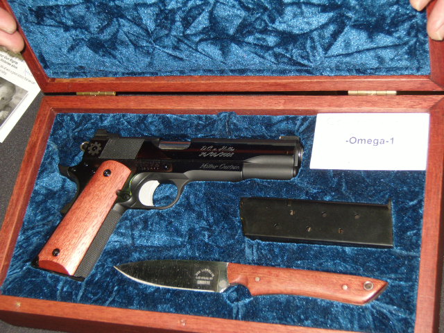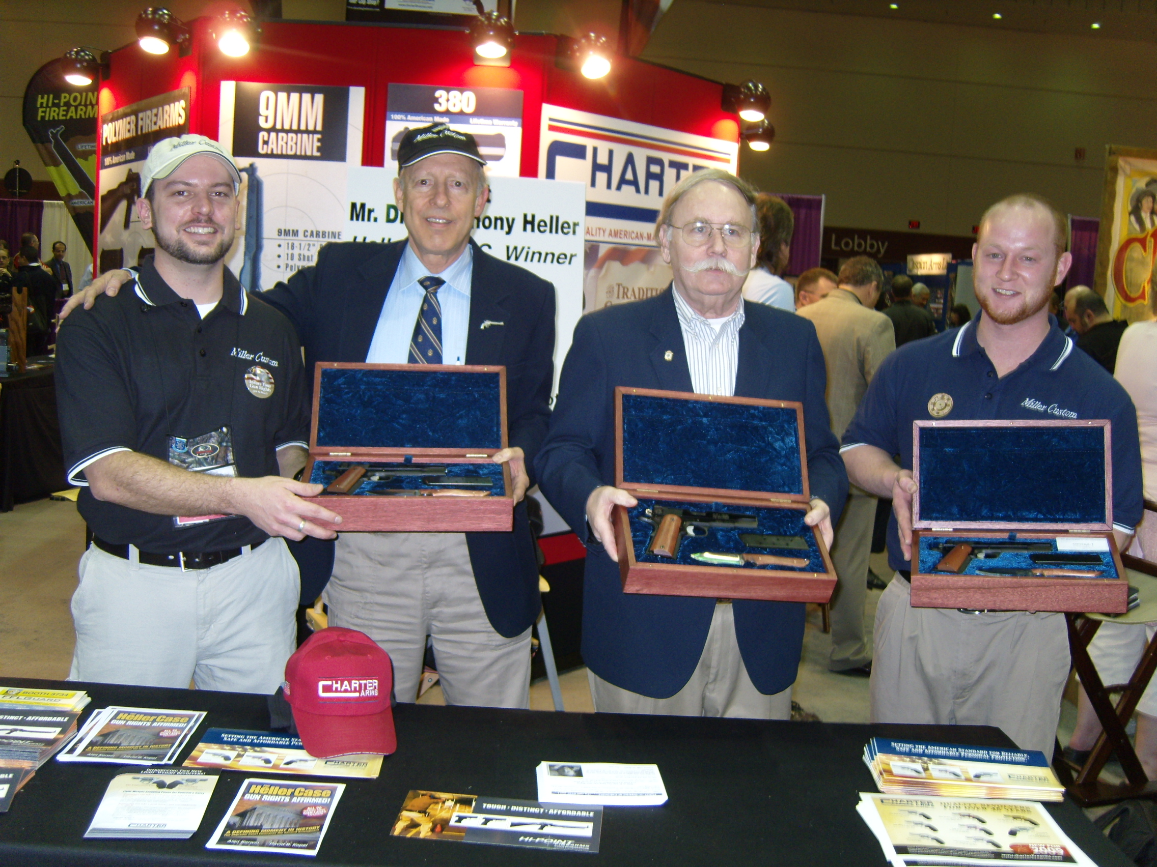 sales@millercustom.comPhone (309)-737-2466 Custom .45 ACP Pistols for Dick Anthony Heller These pistols are to be presented to Mr. Heller in honor of his Supreme Court Victory in regards to the D. C. Handgun Ban and its dismissal. Shot Show has come and here are a few shots of the display case in the NRA booth. There are pictures of the presentation, the booth, and the drawing in which Omega - 1 (screen name at AR15.com) was determined the winner of the 3rd gun. The Project is Done!!! As of January 9th, the Heller project has been completed. As many of you have been patiently waiting to see the results of the efforts of my shop and the people helping to bring you the final product for the presentation, I give you these following pictures.... This project could not have happened without the help of Carver Custom Millwork, Don Llewellyn, Best Upholstery, Acme Sign, Crown Trophy, Innovative Machine, and more. Many thanks go out to all that helped me get these pistols, cases, and knives done in a short time. A huge "Thank You" goes out to John Dixon for organizing the event and most importantly, the Team Members of AR15.com for the donations to make this possible. My hat is off to all of you that donated for this project - it couldn't have happened without your help and support.